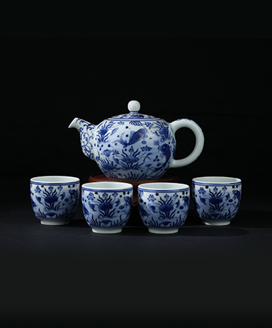 青花水草魚壺四杯組